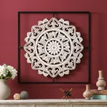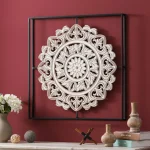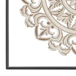 Floral inspired wall decoration with black metal frame Round floral center handcrafted from manufactured wood in a distressed white finish Black metal square frame For indoor display (bedroom, office, family room, dining room) Includes mounting hardware Wall decor arrives ready to mount